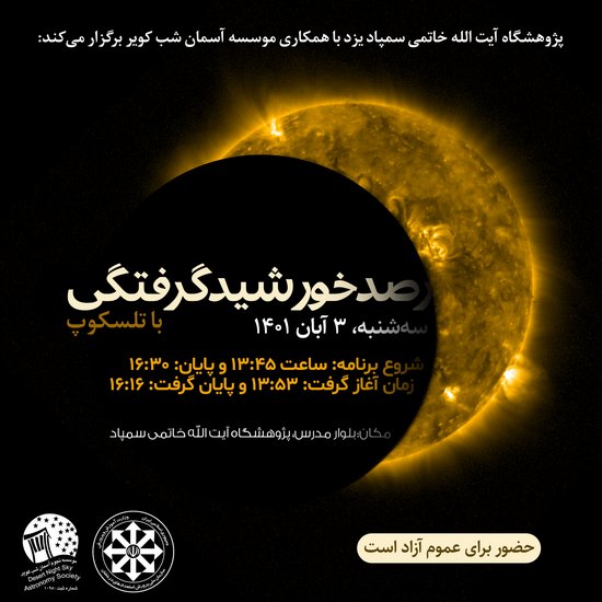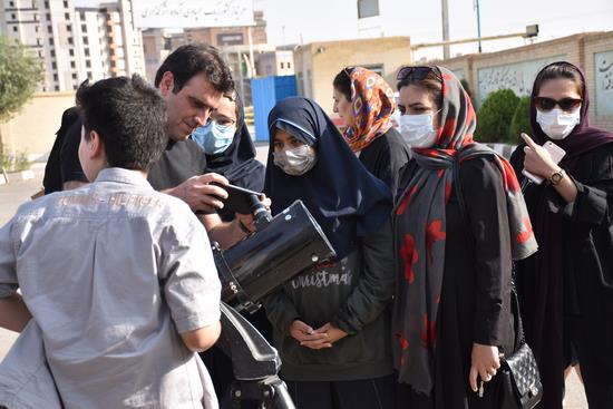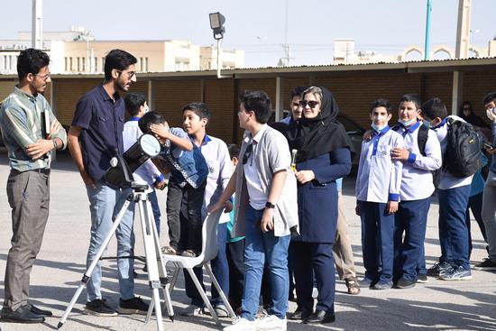 ظهر سهشنبه 3 آبان 1401، حیاط پژوهشگاه آیت الله خاتمی سمپاد یزد، شاهد حضور تعداد زیادی از دانش آموزان و خانواده های علاقمند به نجوم، برای تماشای خورشیدگرفتگی بود. در این برنامه که به همت آقایان سراستاد و دهقانی زاده، دبیران دبیرستان شهید صدوقی و با همکاری موسسه آسمان شب کویر برگزار شد، علاقمندان با تلسکوپ و عکینکها و فیلترهای مخصوص، به تماشای هلال خورشید پرداختند.